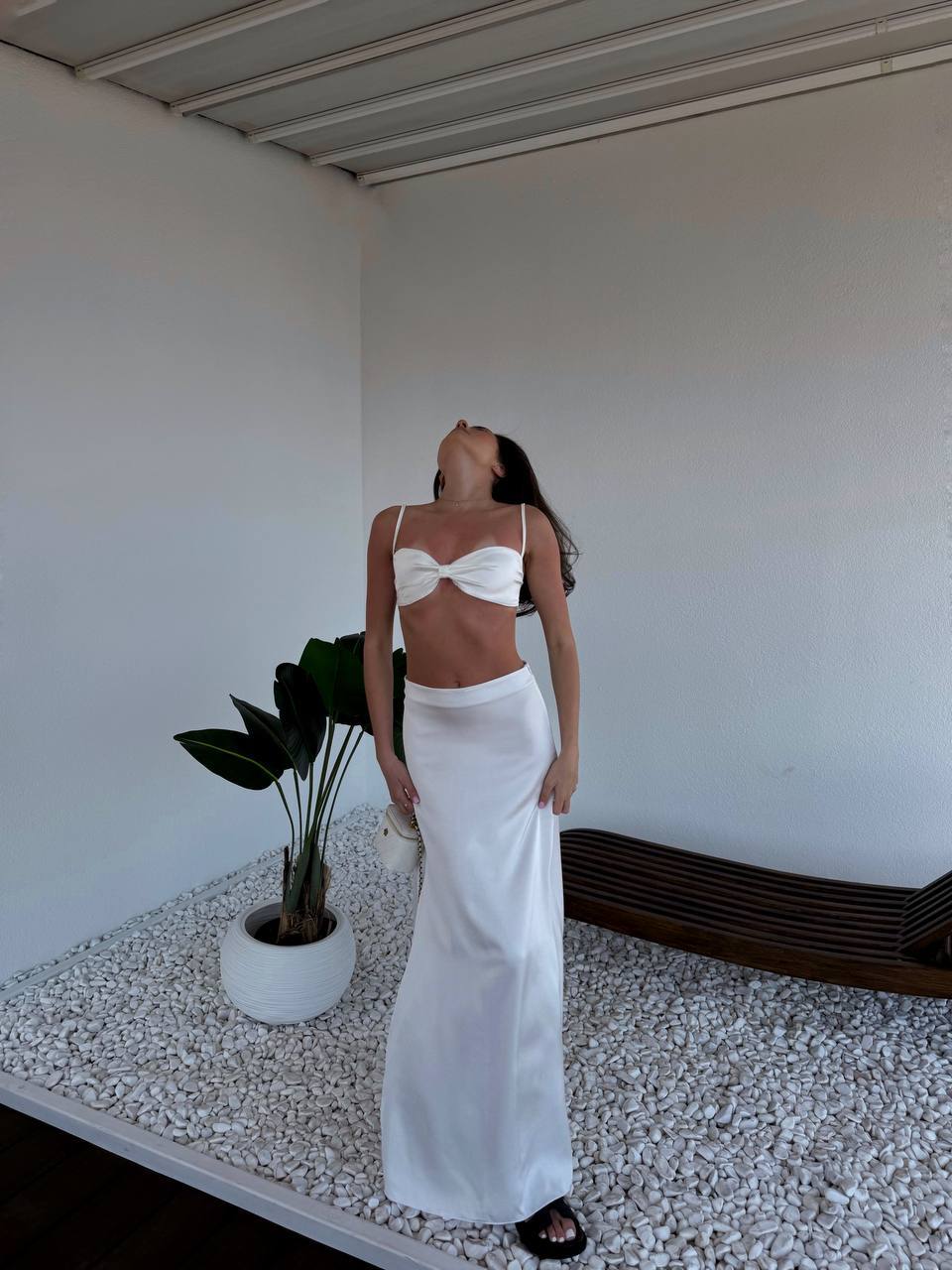 Stylowy dwuczęściowy zestaw składający się z krótkiego topu i długiej, satynowej spódnicy.
