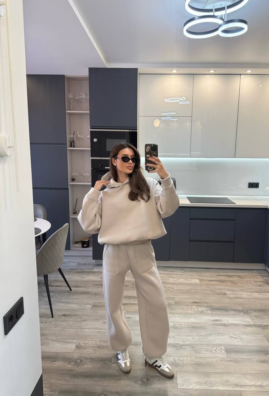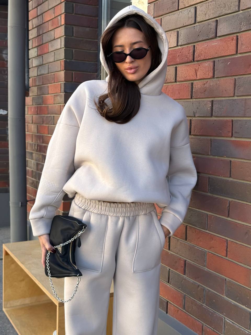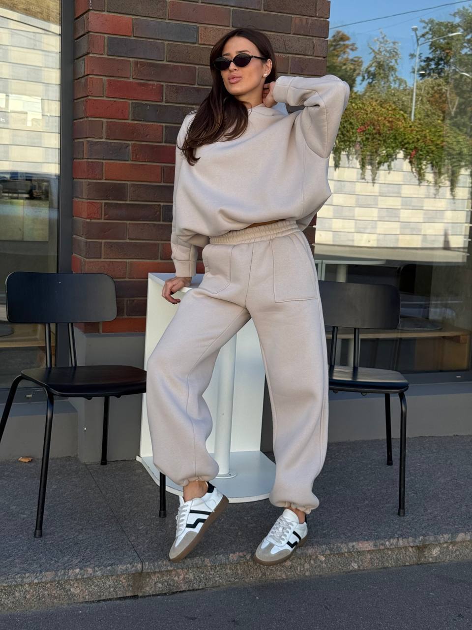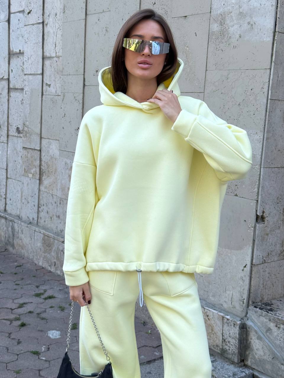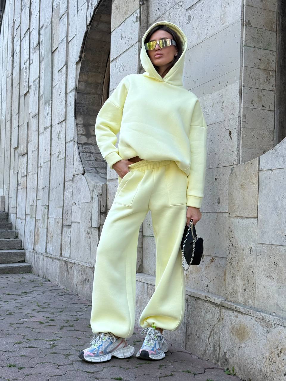 Komfortowy i stylowy zestaw idealny na chłodniejsze dni. Wykonany z przyjemnej w dotyku dzianiny bawełnianej z ociepleniem wewnątrz, dzięki czemu zapewnia ciepło i wygodę. Luźny krój bluzy i spodni gwarantuje swobodę ruchów, a modne kolory sprawdzą się w codziennych stylizacjach.