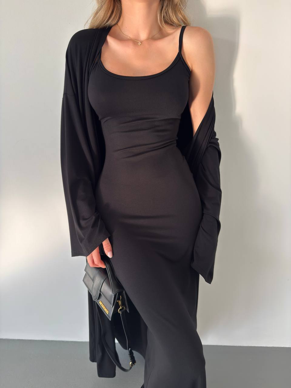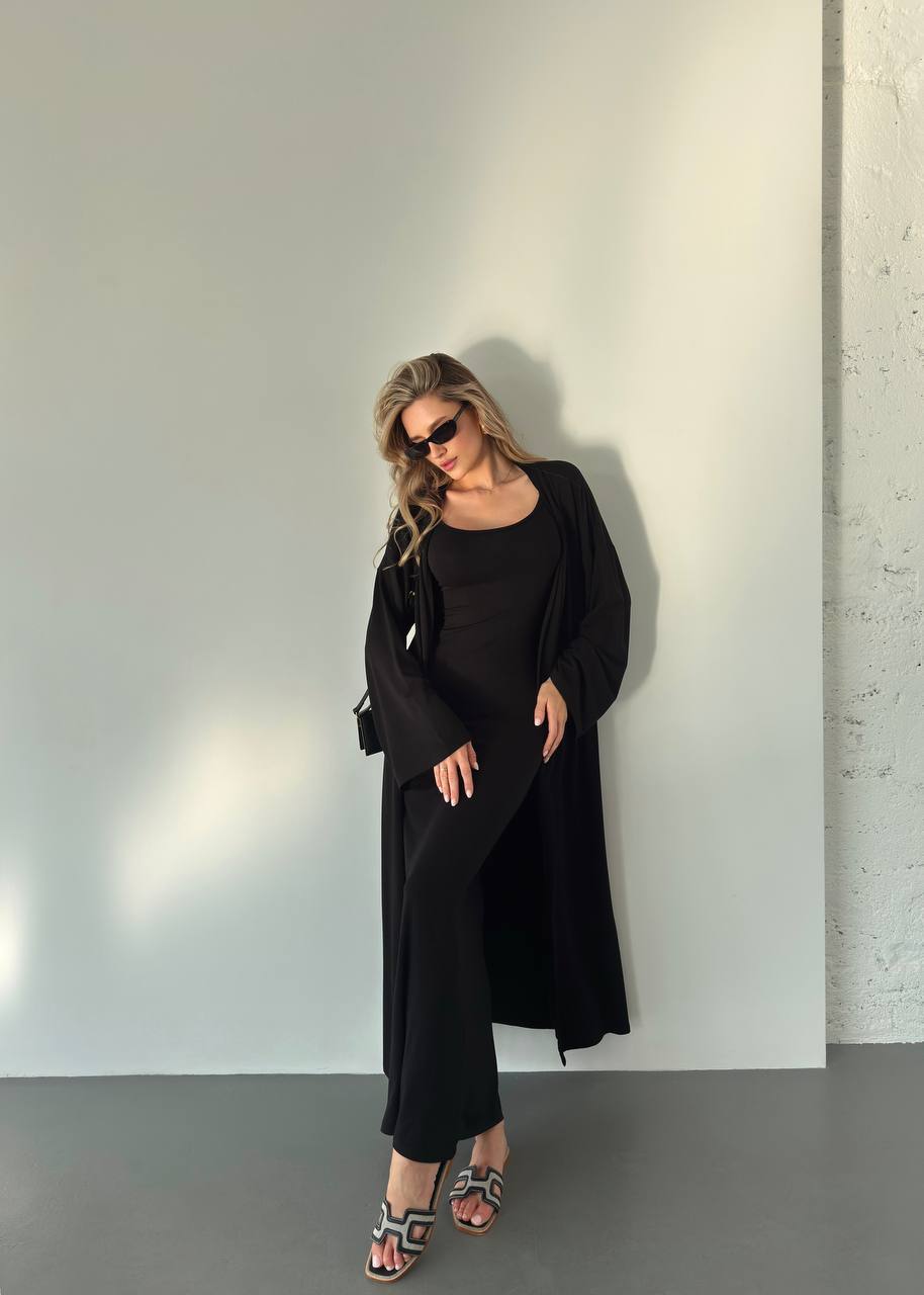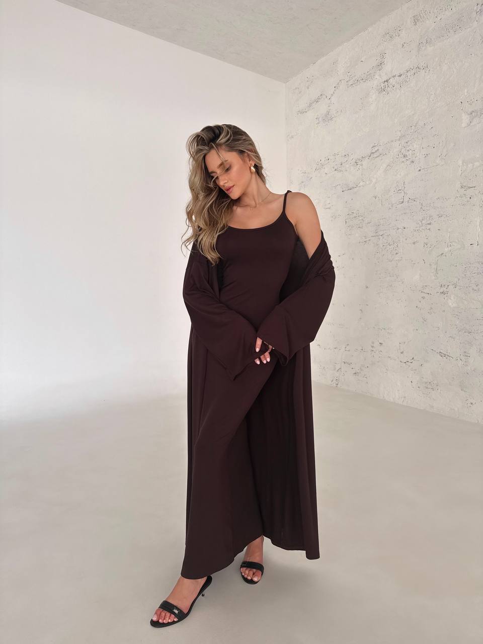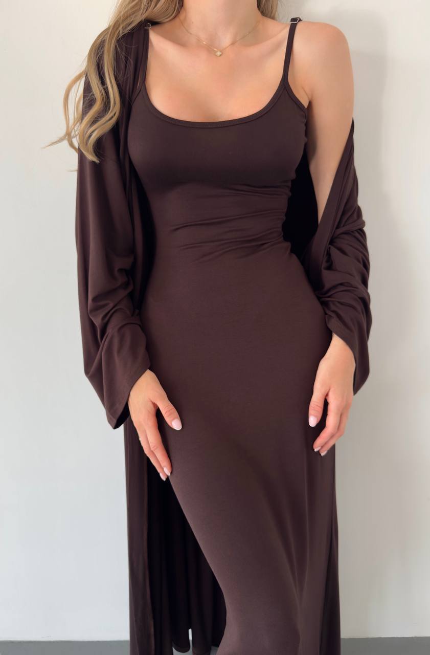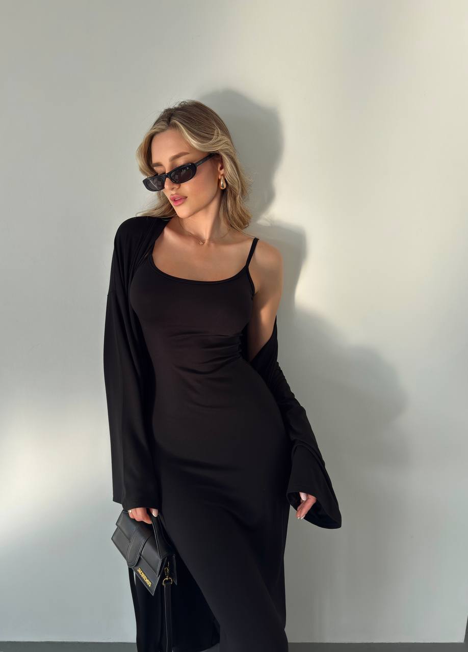 Elegancki komplet z wiskozy składa się z długiej sukienki na cienkich ramiączkach i luźnej narzutki z długimi rękawami. Miękki, lekki materiał zapewnia komfort noszenia, a minimalistyczny krój dodaje klasy. Idealny na co dzień i na specjalne okazje.