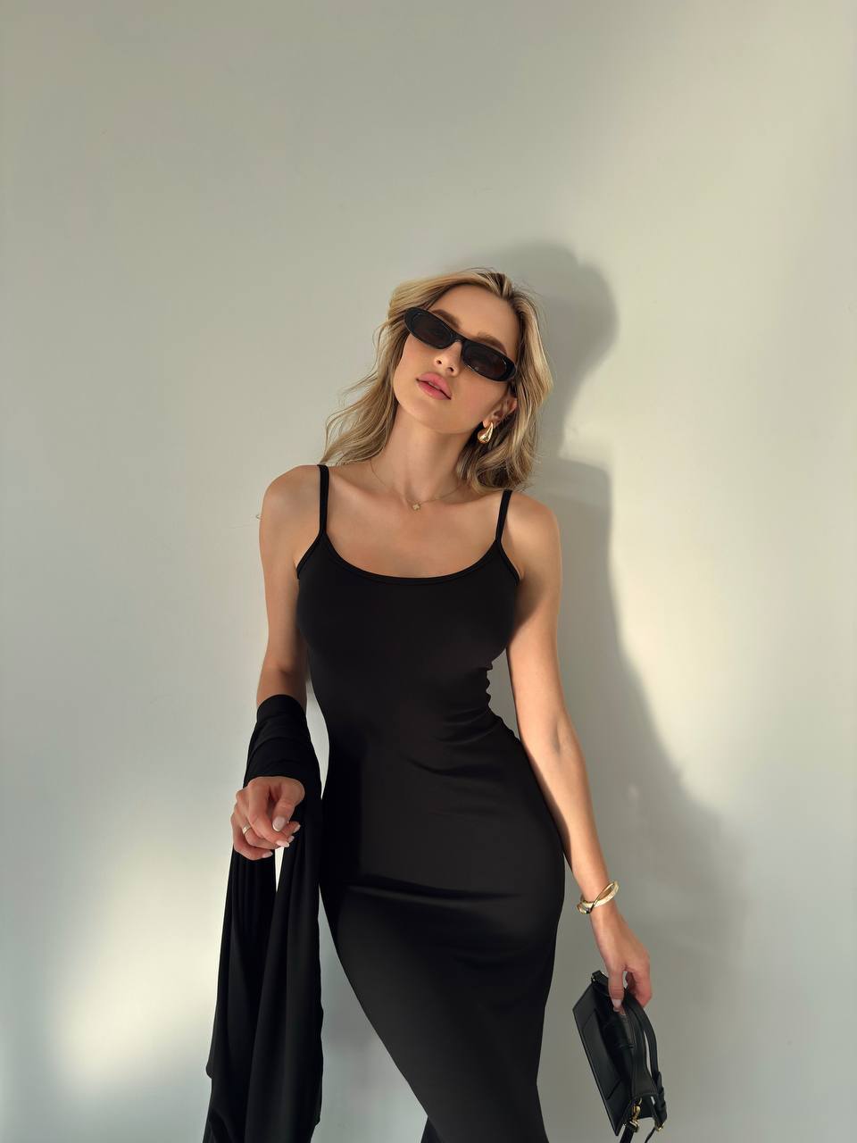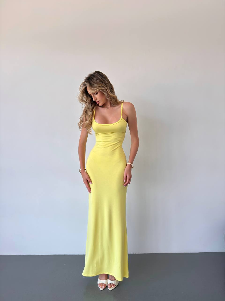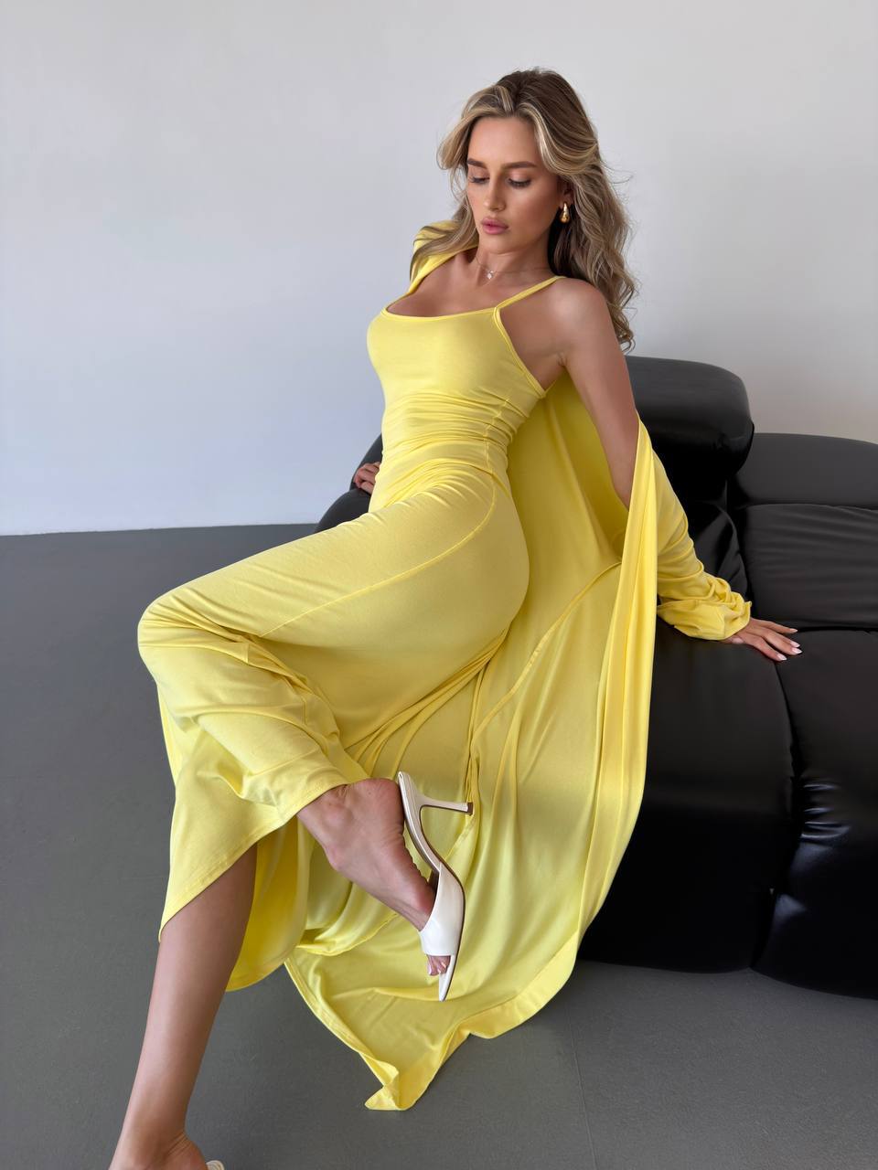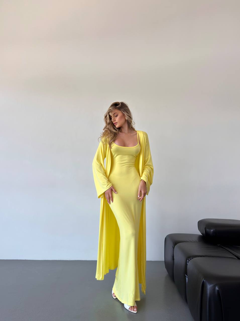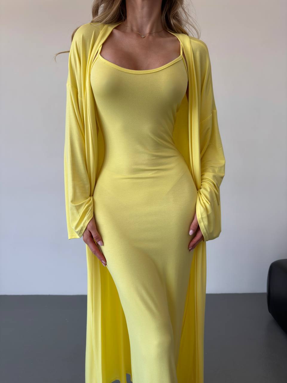 Elegancki komplet z wiskozy składa się z długiej sukienki na cienkich ramiączkach i luźnej narzutki z długimi rękawami. Miękki, lekki materiał zapewnia komfort noszenia, a minimalistyczny krój dodaje klasy. Idealny na co dzień i na specjalne okazje.