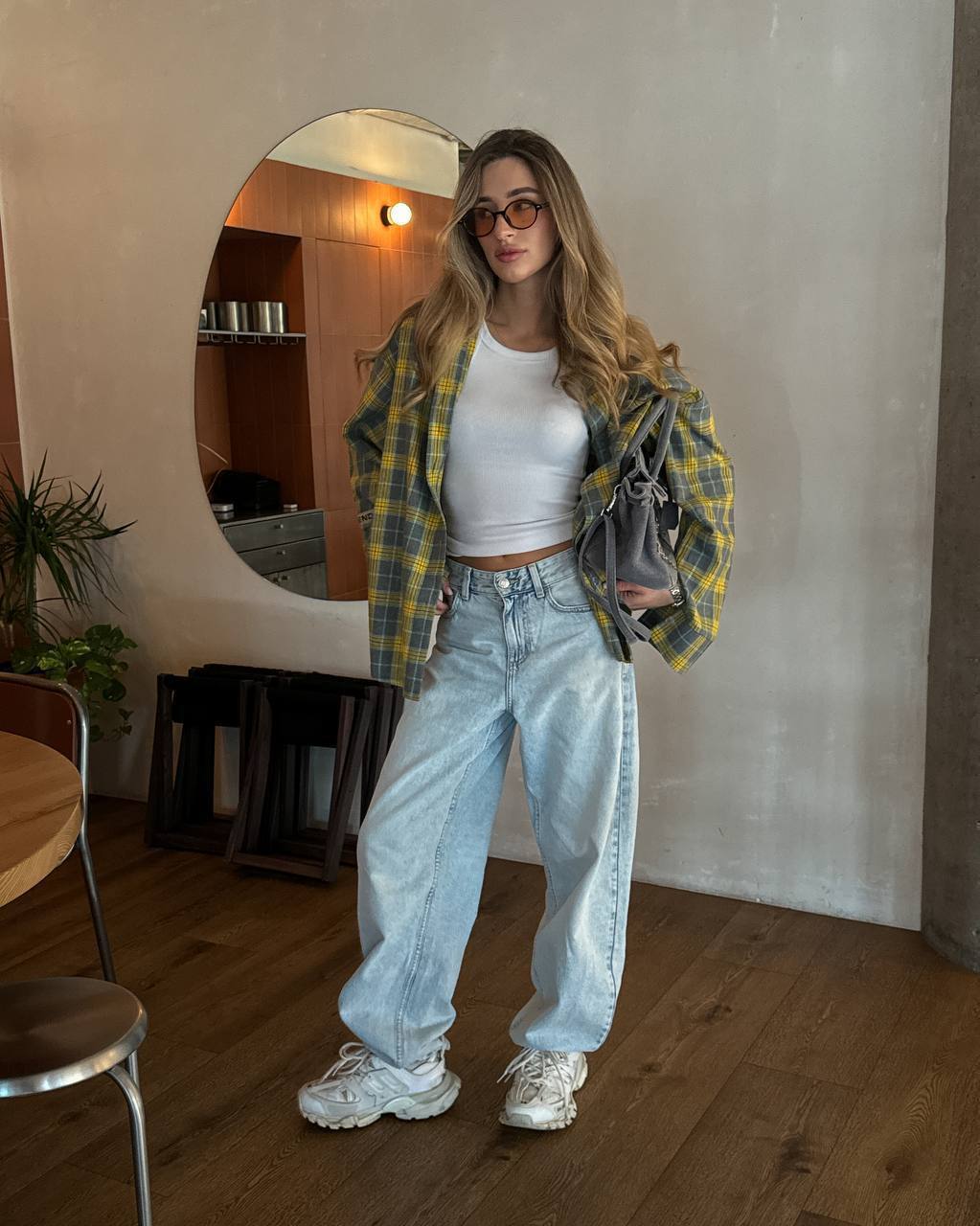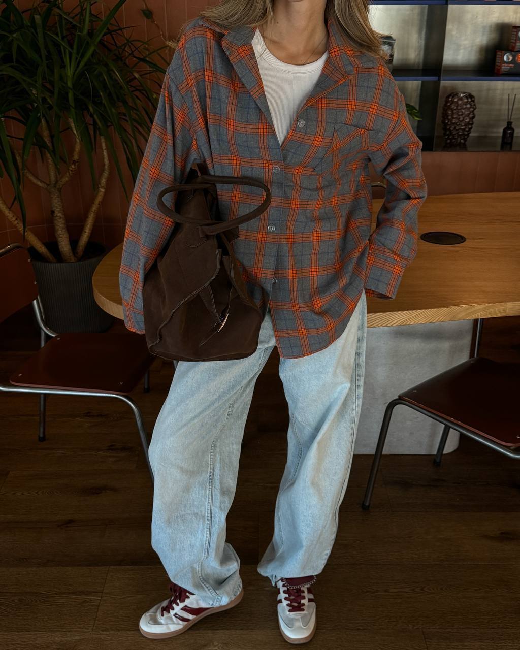 Świetnie komponuje się z szerokimi jeansami, sneakersami lub botkami. Możesz ją nosić luźno lub wpuszczoną częściowo w spodnie – jak pokazano na zdjęciach.