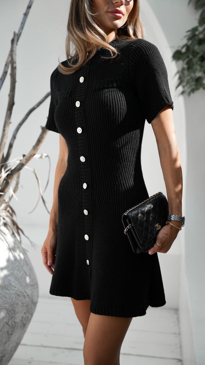 👗 Krój: guziki na całej długości, krótki rękaw, lekko rozkloszowany dół
