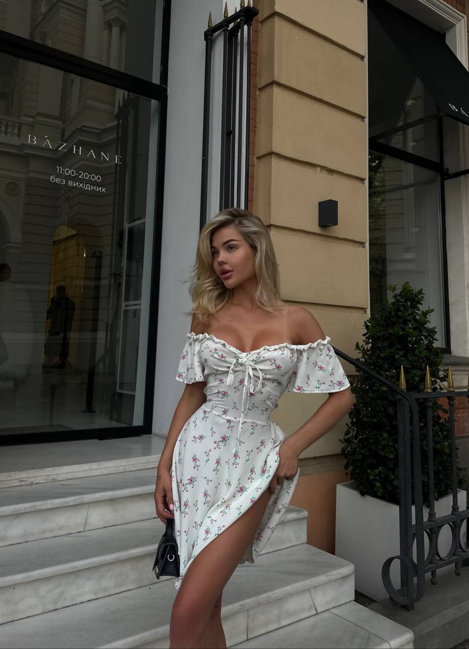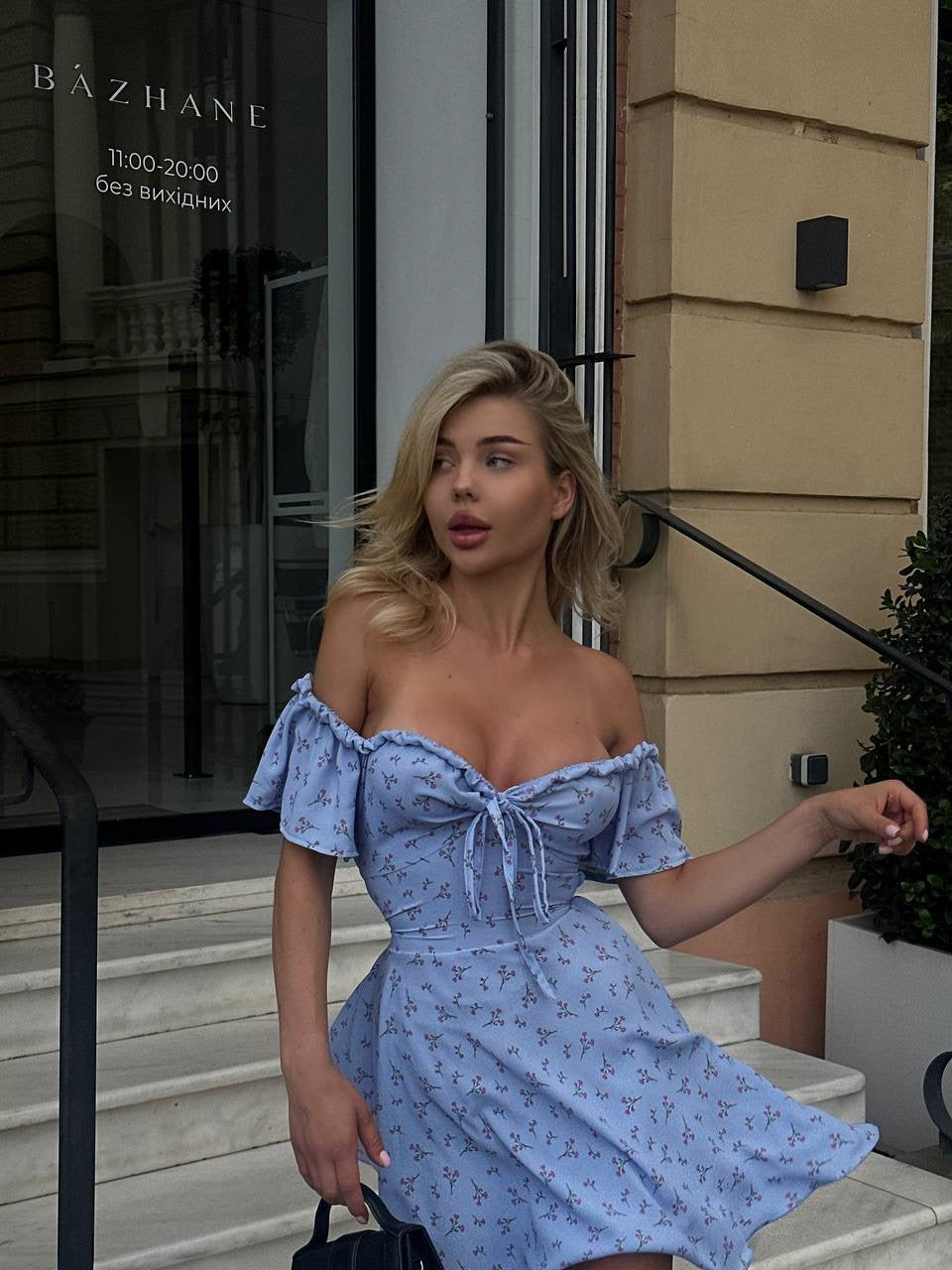 Letnia sukienka o kobiecym kroju, idealna na ciepłe dni. Uszyta z przewiewnej mieszanki wiskozy i poliamidu, zapewnia komfort noszenia oraz piękne ułożenie materiału. Sukienka ma dekolt w kształcie serca, krótki rękaw i efektowne wiązanie z tyłu, które pozwala dopasować fason do sylwetki. Rozkloszowany dół nadaje lekkości i swobody.